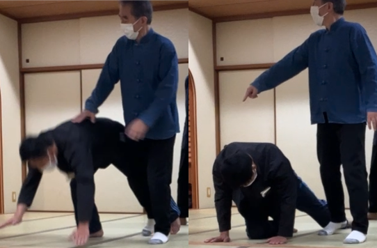 (実験)両手で相手の肩を後ろから軽く叩き、一切力を用いず、魔法のように相手を前のめりに倒すことの出来る跌、これがここにある下歩勢(招式:童子鞠躬:どうしきっきゅう)
