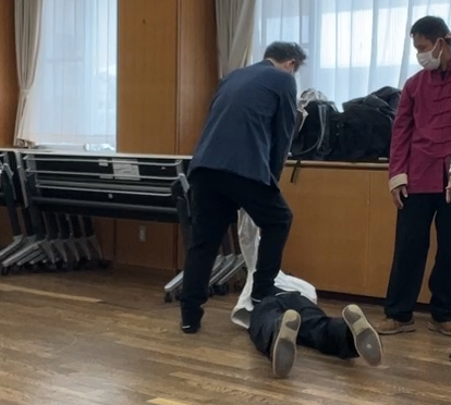 ⑧相手がナイフなどの場合は、倒転陰陽(扌履勢)や天旋地転(栽勢)で相手を跪かせ、翻身勒馬(ほんしんろくば)で右足を後頭部にかけ相手を仰向けにしながら、今回は栽法で道君梱鹿(どうくんこうろく)から、相手の帯脈に腰を下ろし座って、道君梱鹿を維持したまま、相手を床にくくりつける